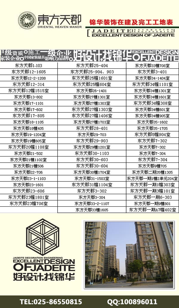 為了更好的讓東方天郡的業(yè)主了解錦華裝飾的整個(gè)工藝流程,錦華裝飾仙林片區(qū)分公司整理了所有東方天郡的完工及在建工地,歡迎大家來參觀。