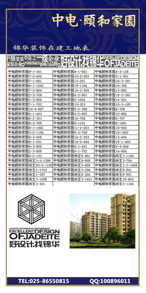 為了更好的讓中電頤和家園的業(yè)主了解錦華裝飾的整個(gè)工藝流程,錦華裝飾鼓北片區(qū)分公司整理了所有中電頤和家園的完工及在建工地,歡迎大家來(lái)參觀。