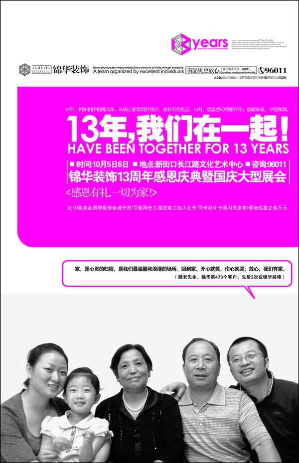 13年來,她服務(wù)了成千上萬戶家庭,為他們創(chuàng)造美好居家生活;13年來,她將優(yōu)秀的設(shè)計、優(yōu)質(zhì)的施工質(zhì)量和服務(wù)帶進千家萬戶,打造的品質(zhì)家裝獲得了大家的肯定;13年來,從“放心家裝”到“好設(shè)計”,從“施工標準白皮書”到“96011客戶服務(wù)熱線”,無論是設(shè)計,質(zhì)量還是服務(wù),她總是走在家裝行業(yè)的前沿,她就是錦華裝飾。