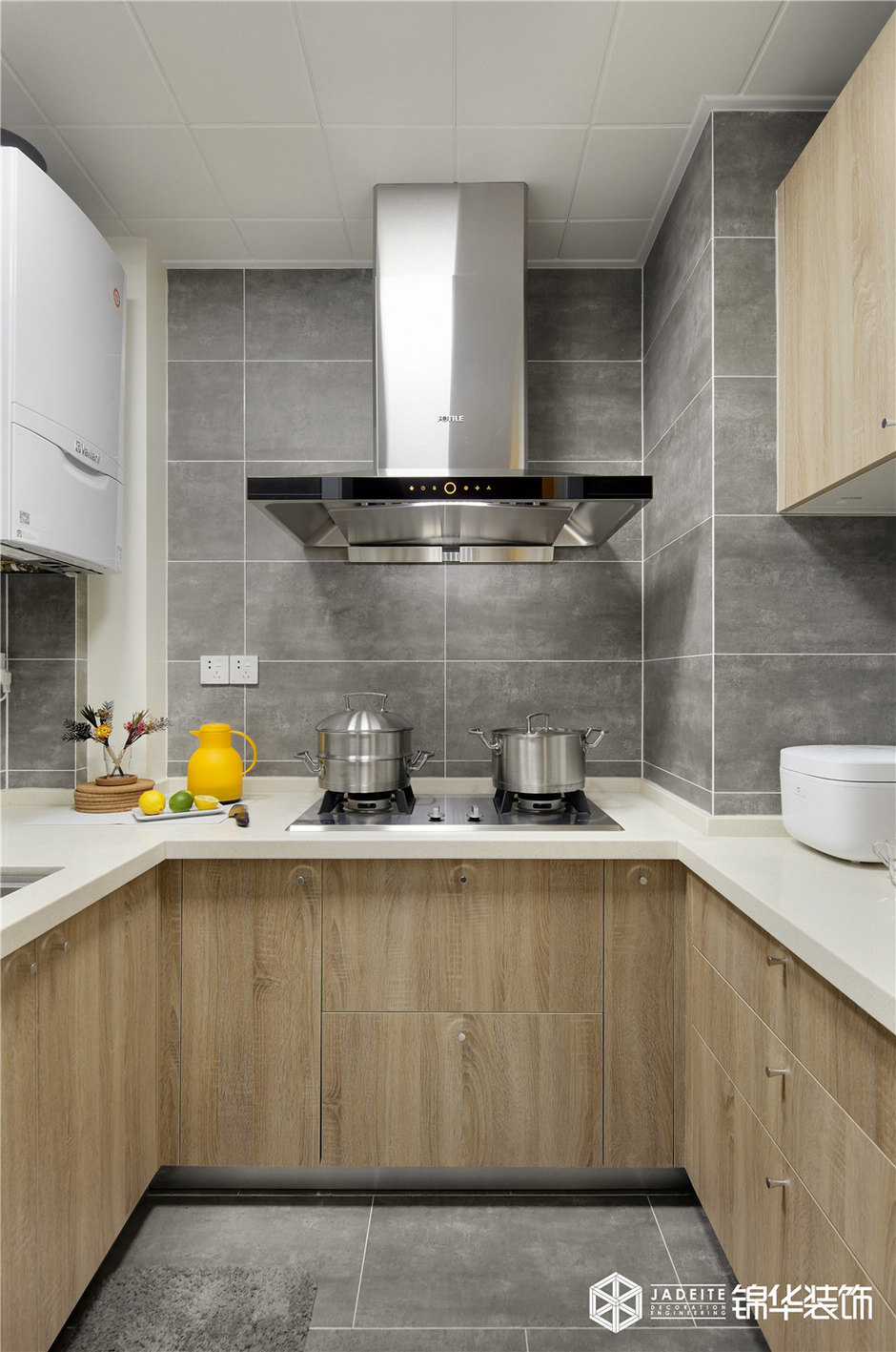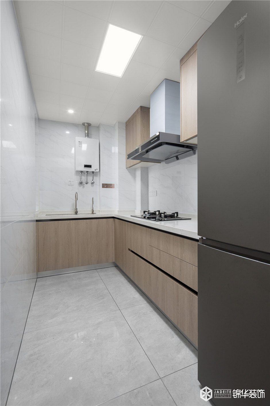 廚房敞開的設(shè)計,讓空間顯得沒有那么的局促,上方的壁櫥大大增加了收納功能。