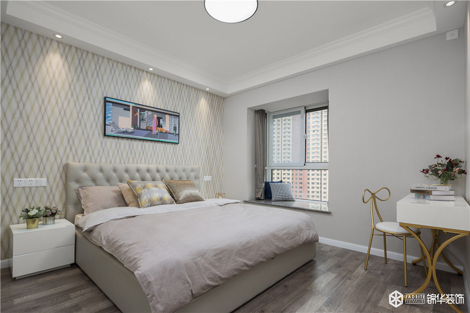 以pu線條代替造價甚高的護墻板,將其直接貼于墻面,增加了空間的層次感,其余的地方則是用不同色彩的墻紙體現(xiàn)空間的活潑性,呈現(xiàn)出空間本身的質(zhì)感與美感,白色和灰色的組合又使得整個空間安靜又舒適。