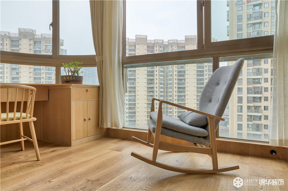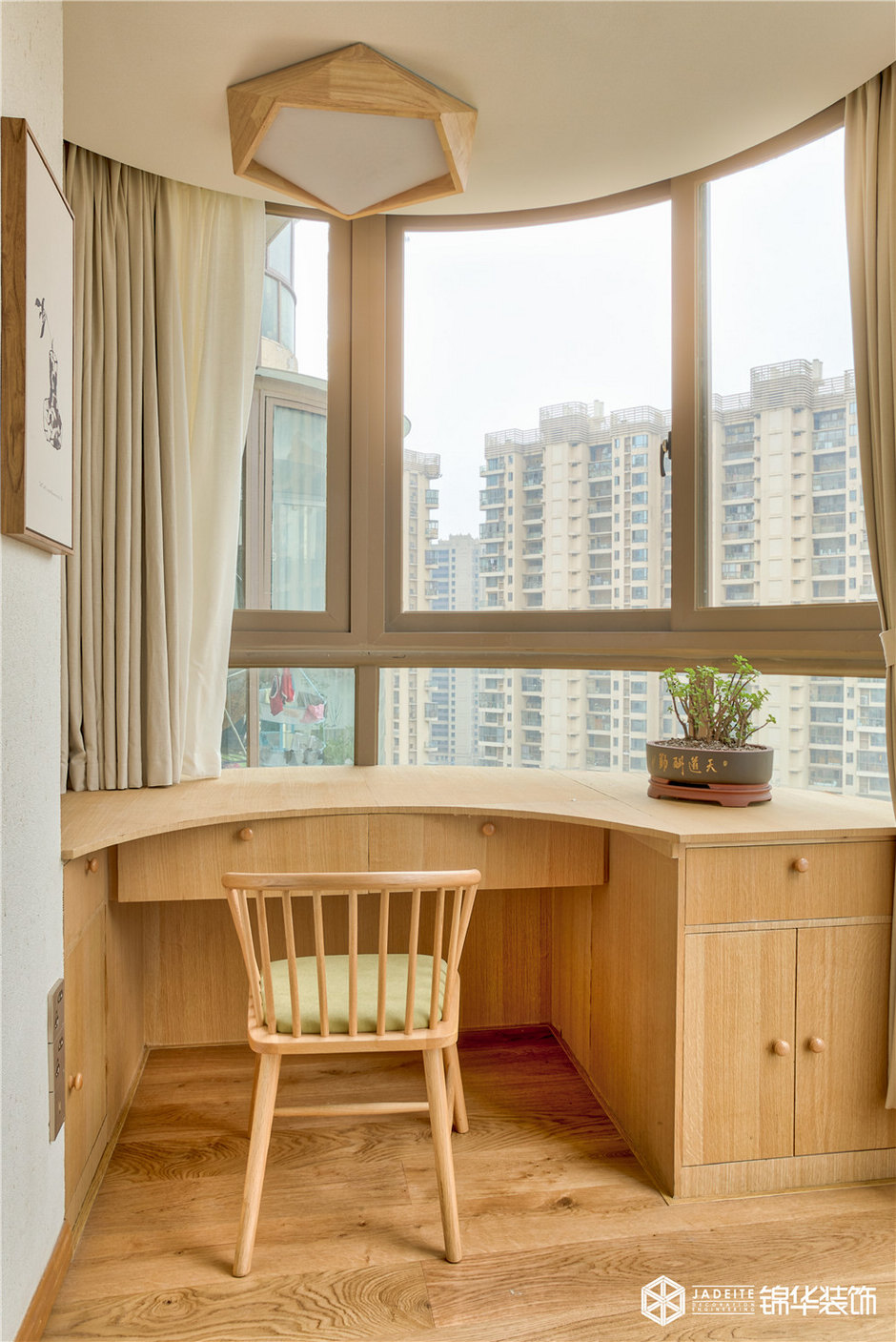 ▲陽臺制作了擱架書桌,業(yè)主偶爾回家時,在臥室也能滿足看書或辦公的需要!