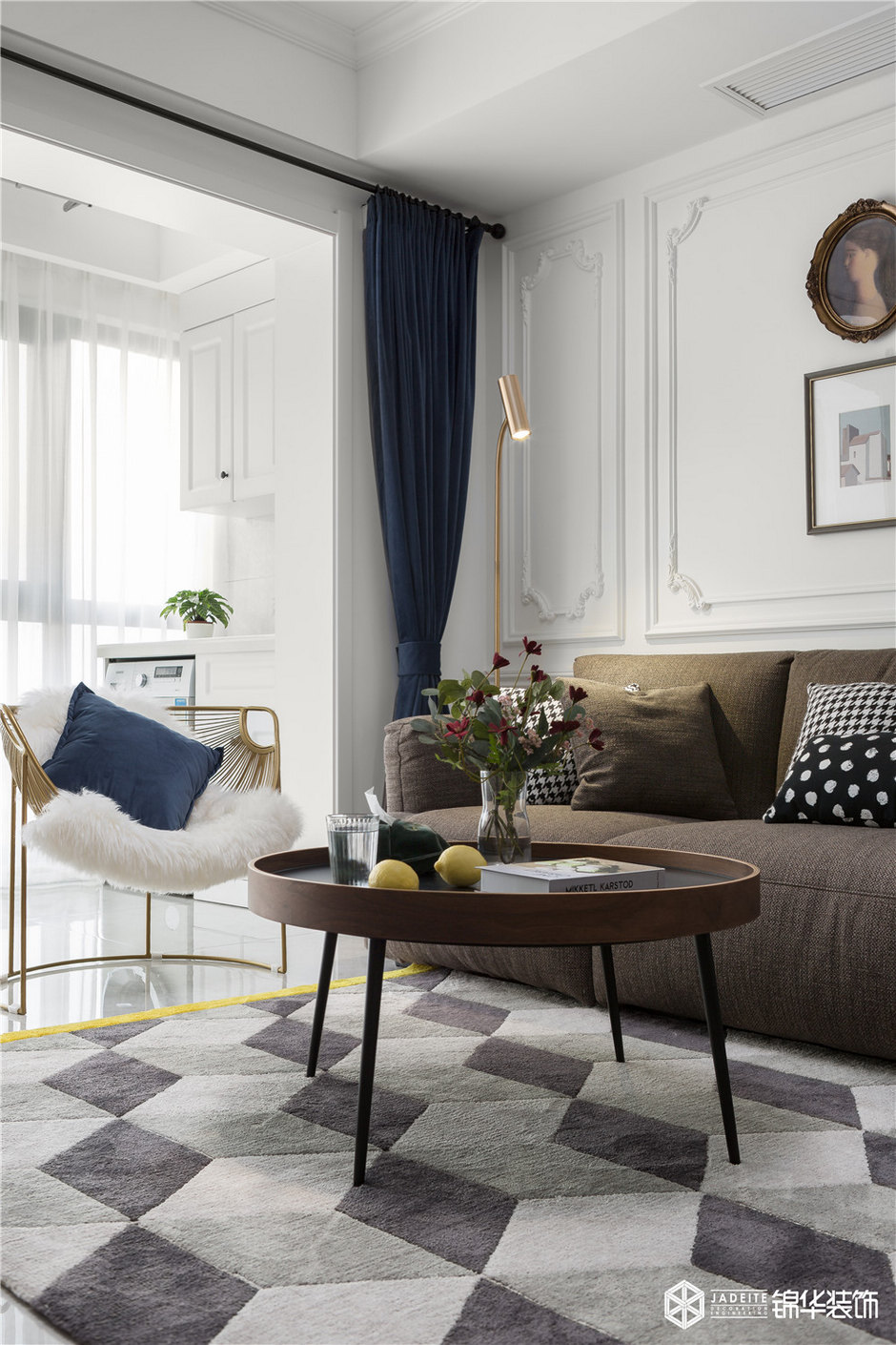 將陽臺空間納入室內(nèi),但因為原陽臺的梁無法拆除,如果將其全部遮蓋,客廳的整體高度會降低,設(shè)計師機智地做了一個美式經(jīng)典的格子頂,美觀實用,然后加已線條做出層次使客廳空間看起來高挑。