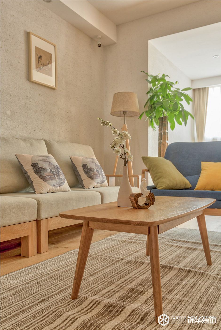▲色調(diào)以黃色、灰色、木色為主,溫暖又活潑。布藝、亞麻、木質(zhì)等天然材料的運用,又為空間平添了一種慵懶的繾綣!