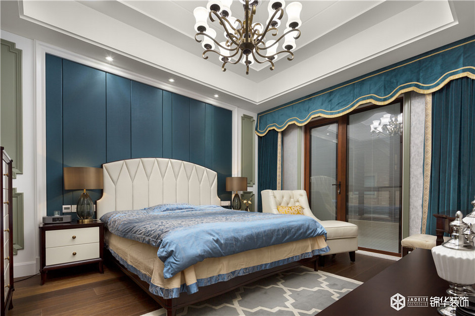 臥室延續(xù)藍(lán)色系,既呼應(yīng)了客餐廳空間的色調(diào),又營造了沉穩(wěn)靜謐的休息氛圍。對于被忙碌生活以及工作包圍的業(yè)主來說,這樣的空間可以緩解白日的疲憊,讓身心得到有效的放松!